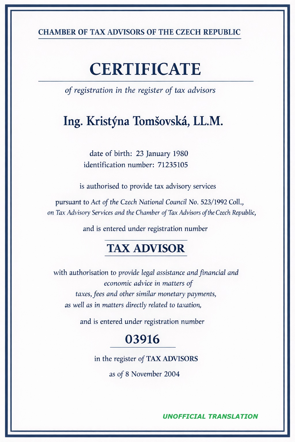 I graduated at the Faculty of Finance and Accounting at the University of Economics in Prague and finished a post-graduate study (LL.M. in commercial law) at the Faculty of Law of Masaryk University in Brno.