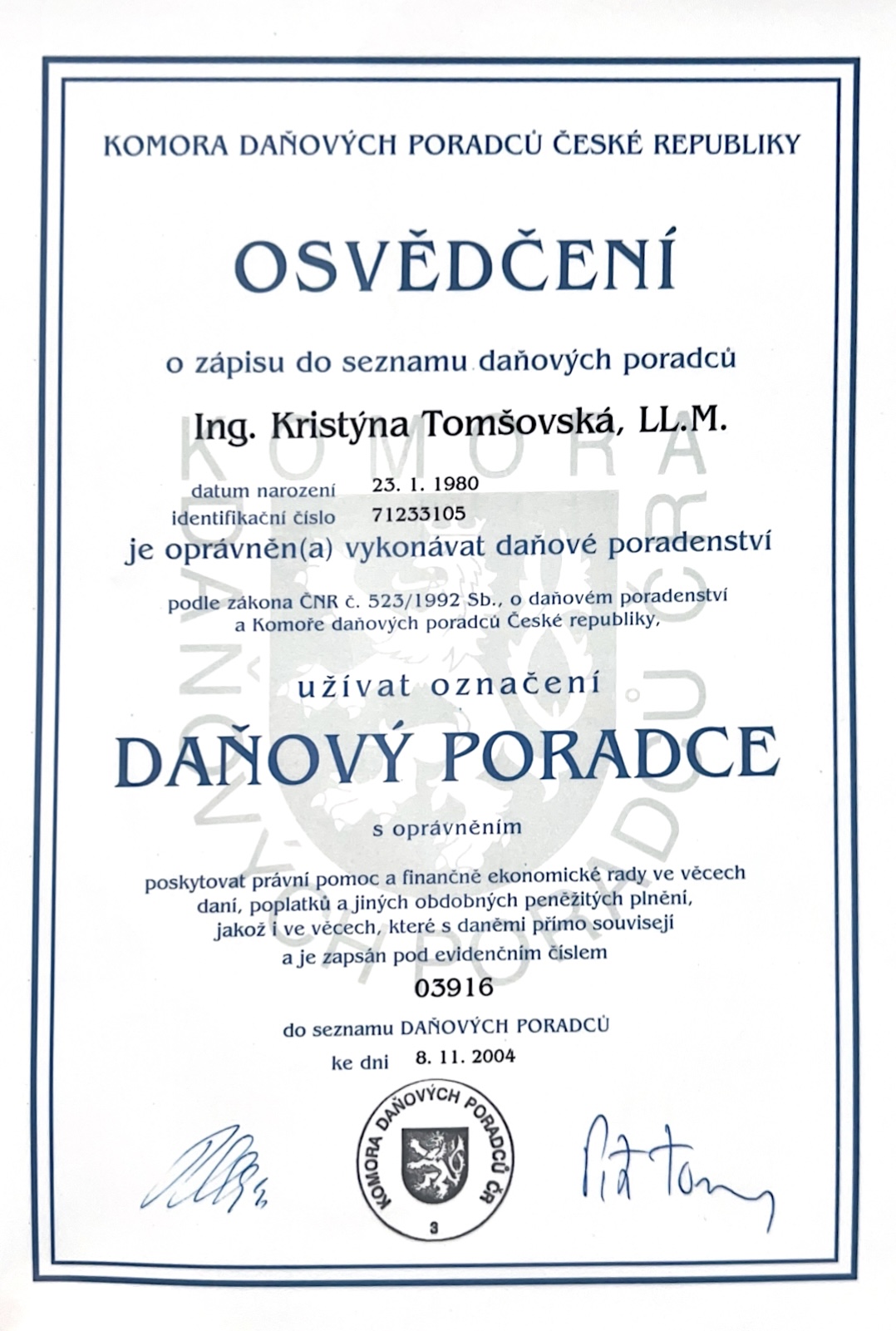 Daňovým poradcem jsem od r. 2004. Specializuji se na oblast daně z příjmů fyzických osob včetně mezinárodního zdanění a problematiku zdravotního a sociálního pojištění u osob s příjmy ze zdrojů v ČR a v zahraničí. Věnuji se rovněž oblasti daně z přidané hodnoty. S ohledem mé praktické zkušenosti s DPH v Německu jsem schopna registrovat Vás k DPH v Německu a zajistit kompletní řešení Vašich daňových povinností v této oblasti.